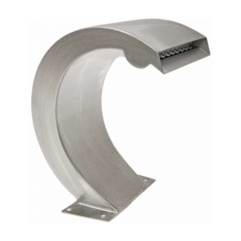 Cascade élégante en acier inoxydable 316L pour bassin de jardin et piscine. La forme recourbée de cette cascade en inox apporte une touche de design dans un jardin à la décoration moderne.